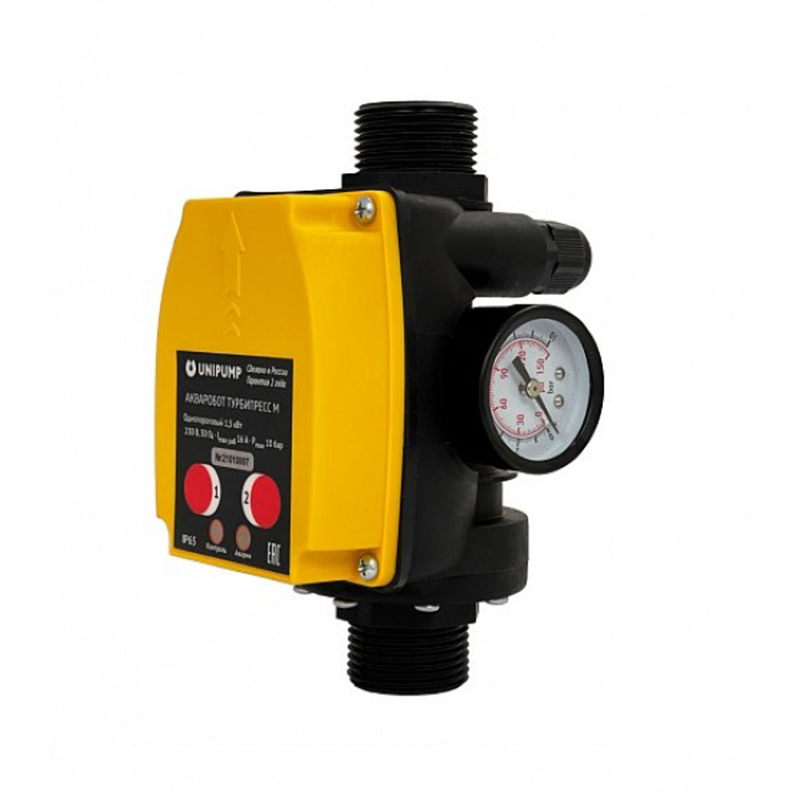 Автоматически включает насос при снижении давления в системе ниже заданного порога или при возникновении потока воды более 2 л/мин.