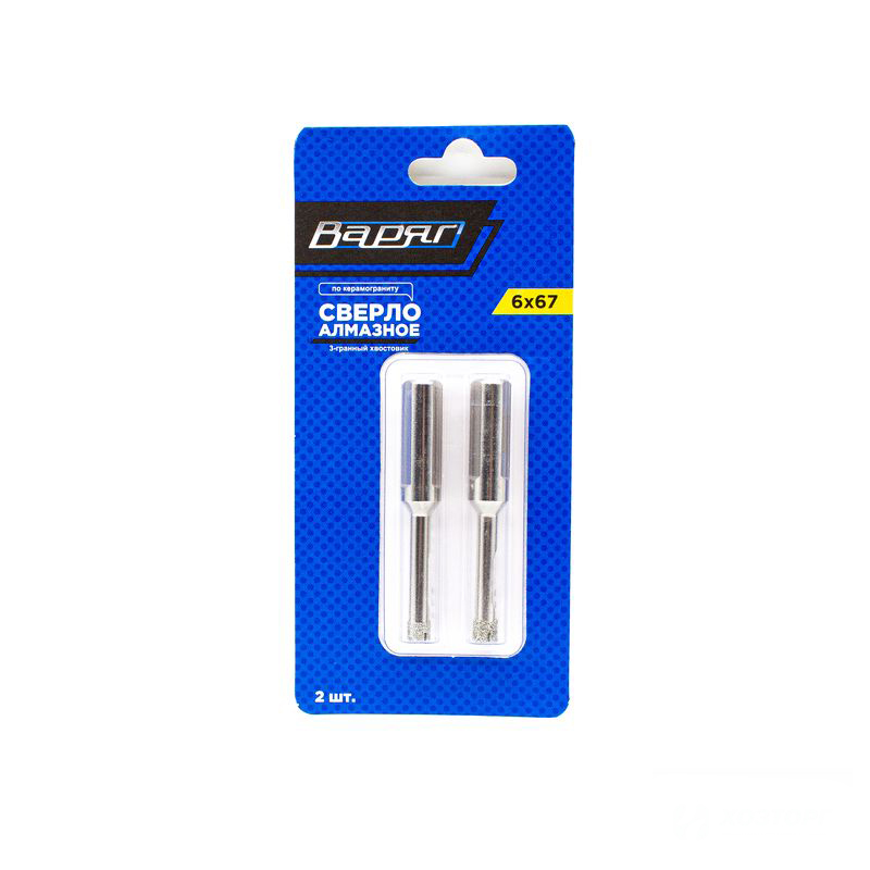 Сверло алмазное по керамограниту 6х67мм, 3-гранный хвостовик 2 шт/комплект ВАРЯГ (40/400)