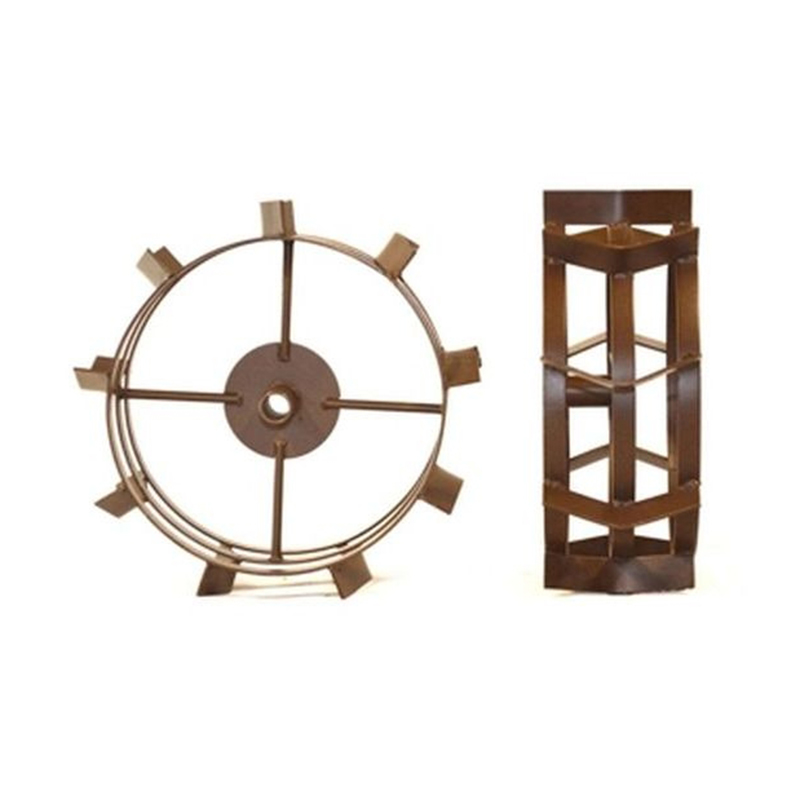 Обод выполнен в виде нескольких полос металла.Почва не налипает, выдавливаясь в пустоты. В результате чего сцепление с грунтом выше.