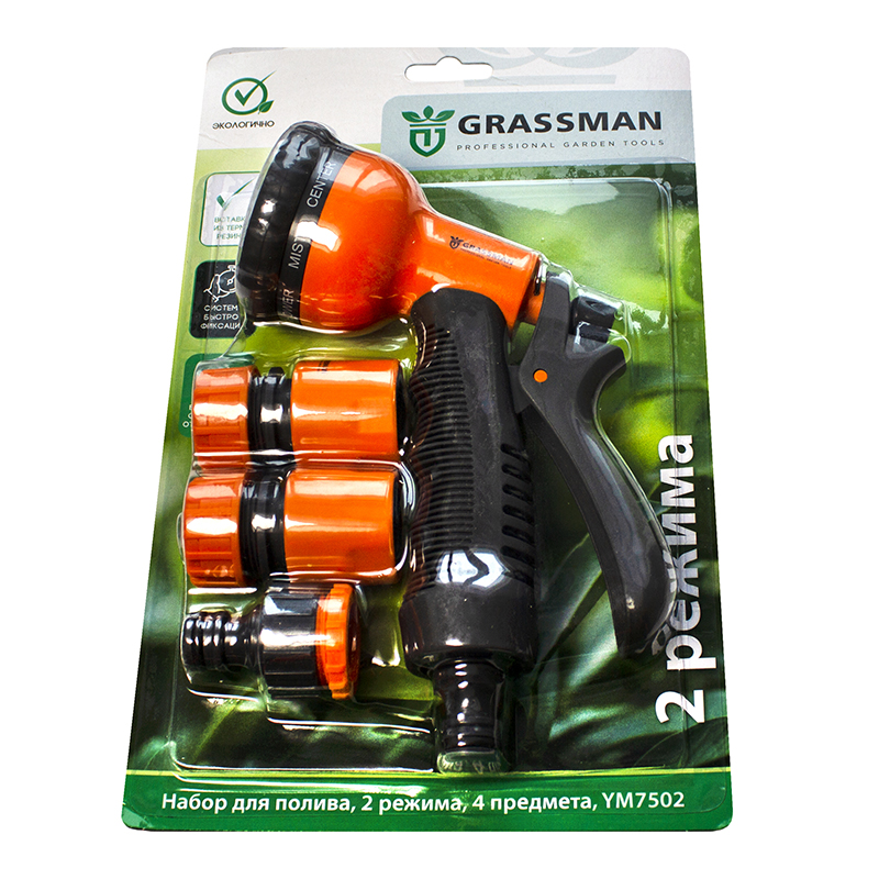 Набор для полива 1/2" ПИСТОЛЕТ 8 РЕЖИМОВ, 2 КОННЕКТОРА 1/2, СОЕДИНИТЕЛЬ, 4 предметов GRASSMAN YM7502 (1/24)