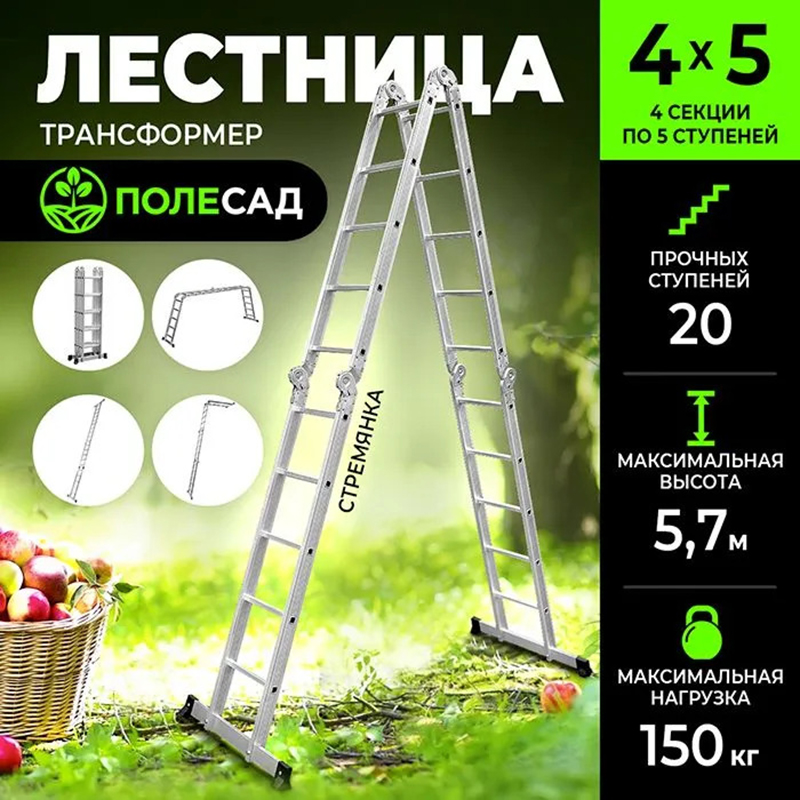 Лестница-трансформер из алюминия ПОЛЕСАД Комфорт 4*5, выс 5,7 м, масса 12,9 кг (1/1)