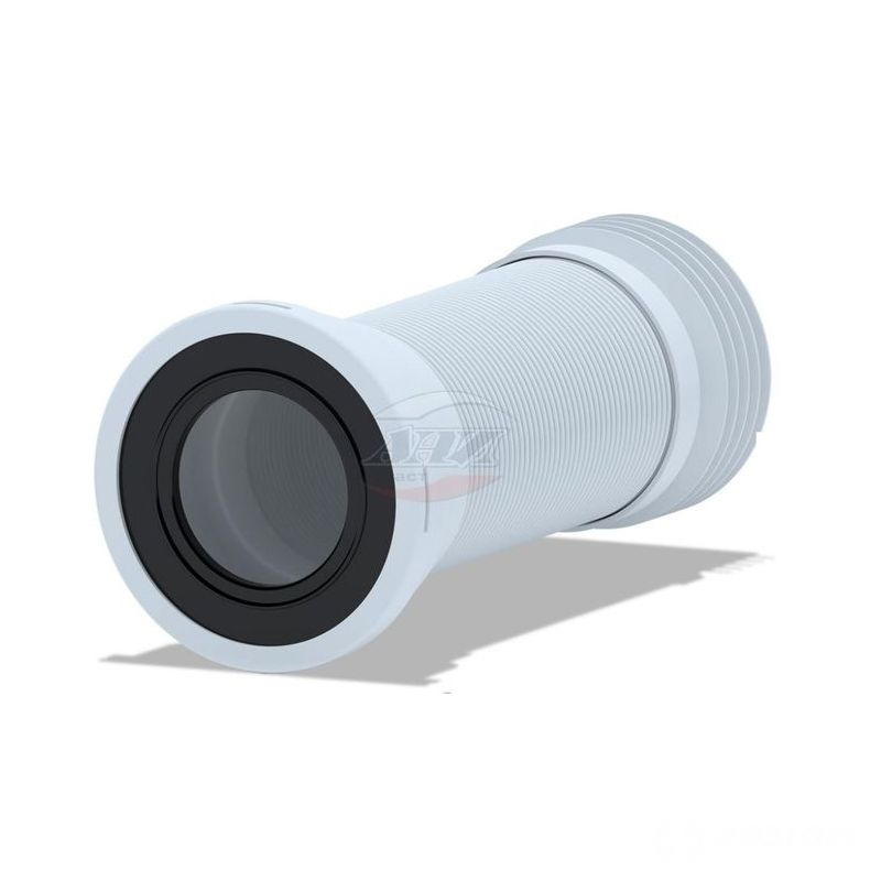 Длина трубы 250-550мм, присоединение к унитазу через резиновую муфту, выход на канализацию 100-110 мм. Для чугунных труб канализации. Удлинители гибкие выполняют функцию фановых труб и предназначены для соединения унитаза с канализационной трубой. Основное преимущество в том, что они легко монтируются и нет необходимости заранее замерять угол и расстояние (как в случае с фановыми трубами). Гофрированная часть трубы армирована металлической проволокой, что значительно повышает прочность и износостойкость изделия.